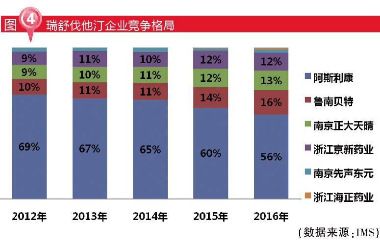 他汀類是治療高膽固醇血癥的首選藥物,瑞舒伐他汀鈣對肝臟具有高選擇性,降脂效果明顯,同時對中樞神經的副作用較其他他汀顯著減小,被譽為“超級他汀”。據IMS數據統(tǒng)計,2016年全國瑞舒伐他汀市場規(guī)模約28億元,阿斯利康市場份額不斷在萎縮,2016年占比56%,魯南貝特占比16%、京新藥業(yè)占比12%、正大天晴占比13%。