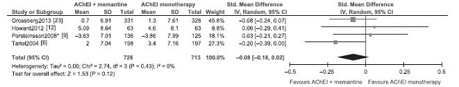 圖1在日常生活活動(dòng)中聯(lián)合膽堿酯酶抑制劑加美金剛的治療對比膽堿酯酶抑制劑單獨(dú)治療的(ADCS-ADL和BADLS)的效果薈萃分析結(jié)果。 *分組的中度患者數(shù)據(jù)取自溫布萊德等人的薈萃分析。 [28]。 AChEI,乙酰膽堿酯酶抑制劑; ADCS-ADL,阿爾茨海默氏病合作研究 - 日常生活活動(dòng)能力; BADLS,日常生活能力量表的布里斯托爾的活動(dòng);標(biāo)準(zhǔn),規(guī)范.