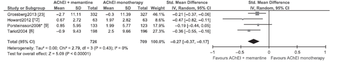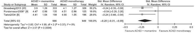 圖4聯(lián)合膽堿酯酶抑制劑加美金剛的治療對比膽堿酯酶抑制劑單獨(dú)治療對認(rèn)知功能效果的薈萃分析結(jié)果(ADAS-齒輪和SIB)。*分組的中度患者數(shù)據(jù)取自溫布萊德等人的薈萃分析 [28]。 AChEI,乙酰膽堿酯酶抑制劑; ADAS-COG,阿爾茨海默病評定量表認(rèn)知分量表; SIB,嚴(yán)重?fù)p害電池;標(biāo)準(zhǔn),規(guī)范。