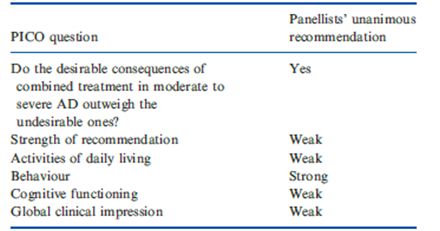 在第二輪的尋找共識過程之后,小組成員達(dá)成共識。各小組成員仍然同意第一輪的結(jié)果,與CHEI單一療法相比,所希望的CHEI和美金剛聯(lián)合治療效果超過在中重度AD患者身上的不良影響。但有一個(gè)例外存在著但也同意第一輪,總的贊成聯(lián)合治療的建議很弱。所有小組成員給ADL了一個(gè)弱推薦,但有兩個(gè)例外的行為強(qiáng)烈推薦以及認(rèn)知的一個(gè)弱推薦和GCI的三個(gè)例外弱推薦。在第二輪小組成員都同意推薦并贊成合并CHEI加美金剛治療總結(jié)于表2中。