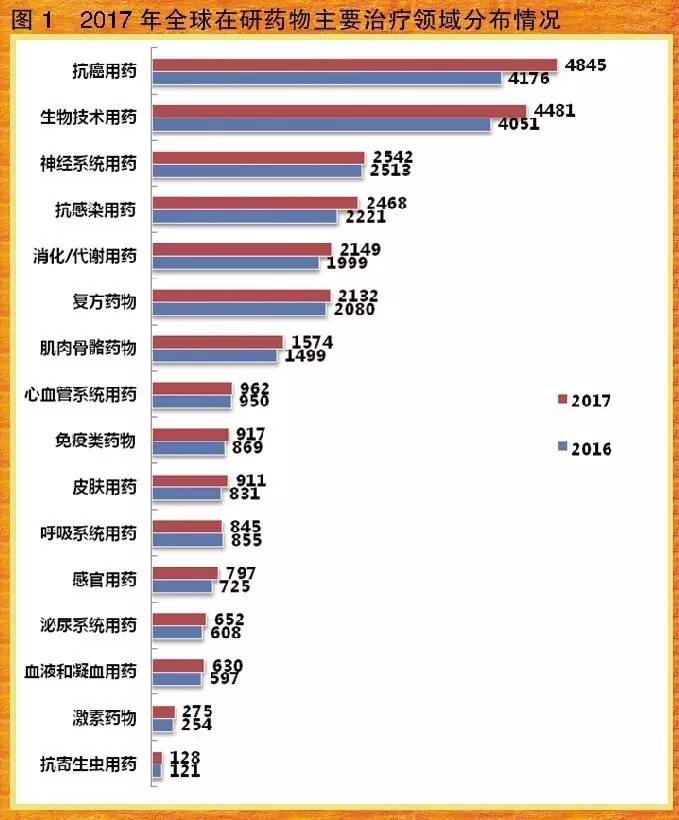筆者對Pharmaprojects數據庫16個主要治療領域以及生物技術類別的在研藥物情況進行分析發(fā)現,除呼吸系統用藥外,2017年各治療領域的在研新藥數量均呈現增長態(tài)勢。