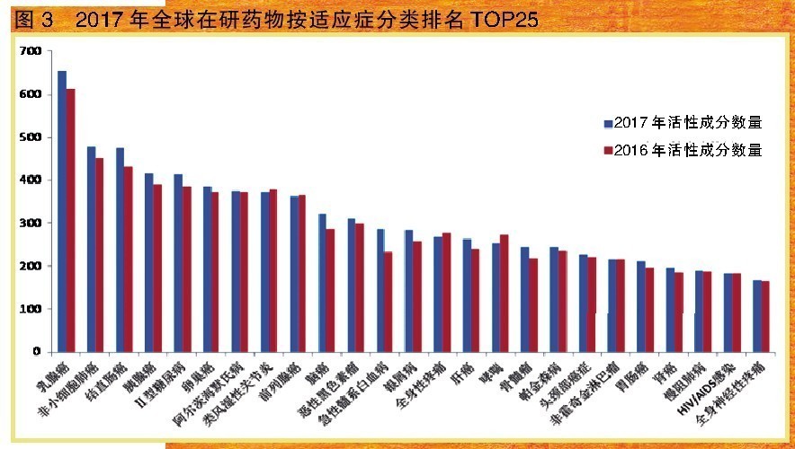 從治療類別TOP 25排名中發(fā)現,一般抗癌藥(在研藥物2231個)、免疫類抗癌藥(2001個)、抗感染預防性疫苗(848個)、糖尿病治療藥物(624個)、其他眼科用藥(615個)為排名居前五位的治療類別,該排名順序與2015和2016年順序一致。
