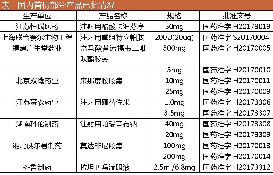 2017年已批上市的首仿產(chǎn)品主要有:恒瑞的注射用醋酸卡泊芬凈、廣生堂富馬酸替諾福韋二吡呋酯膠囊、雙鷺的來(lái)那度胺膠囊、豪森的注射用硼替佐米、科倫的注射用帕瑞昔布鈉、湘北威爾曼制藥的莫達(dá)非尼膠囊、齊魯制藥拉坦噻嗎滴眼液、上海聯(lián)合賽爾的注射用重組特立帕肽等。首仿產(chǎn)品技術(shù)先進(jìn),可以培育新的市場(chǎng),利潤(rùn)較為可觀,產(chǎn)品創(chuàng)新難度相對(duì)較低,可為企業(yè)帶來(lái)不錯(cuò)的業(yè)績(jī),未來(lái)在高端產(chǎn)品領(lǐng)域?qū)崿F(xiàn)進(jìn)口替代的局面將不斷加劇。