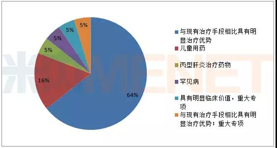 從56個申請“新藥上市”的產(chǎn)品入選優(yōu)先審評的原因看,“與現(xiàn)有治療手段相比具有明顯治療優(yōu)勢”是主要入選原因,占據(jù)64%的比例,“兒童用藥”以16%的比例緊接其后,“丙型肝炎治療藥物”、“罕見病”等以5%的比例并排第三??梢奀DE在選擇優(yōu)先審評產(chǎn)品時,“偏愛”具有明顯臨床優(yōu)勢,以及丙肝、兒童用藥、罕見病等臨床較為欠缺的產(chǎn)品,這也為藥企研發(fā)新藥提供了一定的方向指引。