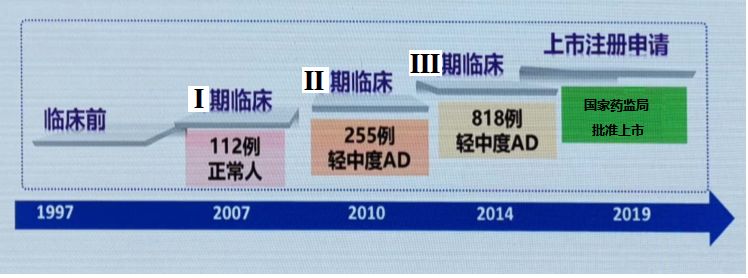 自1997年起,中國科學(xué)院上海藥物研究所耿美玉研究員領(lǐng)導(dǎo)的研究團隊開始從事中國造首個抗老年癡呆癥新藥GV-971的研究,她帶領(lǐng)團隊與生物醫(yī)藥企業(yè)緊密合作,不僅完成了新藥上市前的所有研發(fā),還揭示了老年癡呆癥全新的發(fā)病機制,2019年11月2日國家藥監(jiān)局批準了上海綠谷制藥有限公司治療阿爾茨海默病新藥“九期一”(甘露特鈉,代號:gv-971)的上市申請,研發(fā)歷程如下圖所示: