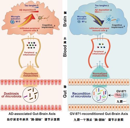 2019年9月6日,中國科學(xué)院上海藥物研究所耿美玉教授團隊在Cell Research雜志上揭示了GV-971是通過靶向腦-腸軸發(fā)揮其治療阿爾茨海默病的作用機制,概括如下:
