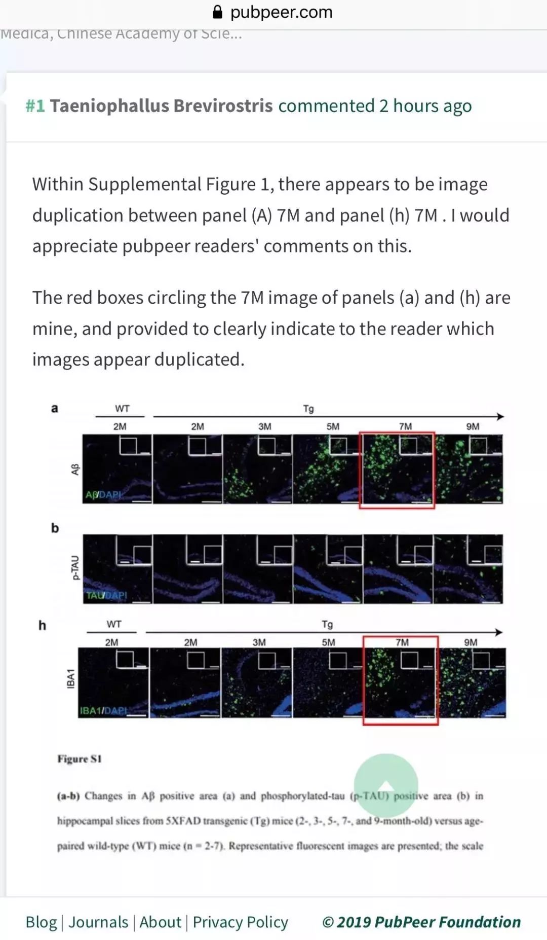 PubPeer是美國知名打假網(wǎng)站,鼓勵(lì)科研人員匿名對已發(fā)表的論文進(jìn)行評論。“商業(yè)人物”在PubPeer搜索時(shí)發(fā)現(xiàn),耿美玉有五篇論文遭批,其中便包括這篇“小鼠實(shí)驗(yàn)”論文。質(zhì)疑聲出現(xiàn)在“九期一”獲得上市批準(zhǔn)不久,之后也有其他學(xué)者加入。