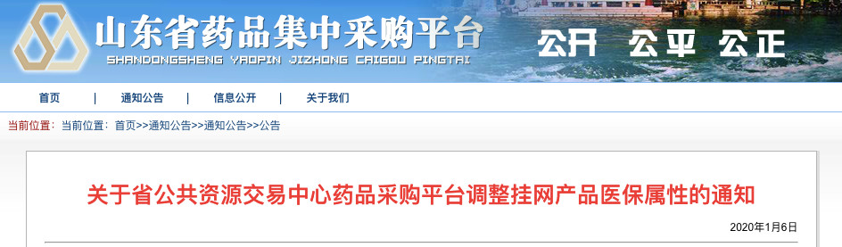 通知顯示,自2020年1月1日起,山東省基本醫(yī)療保險(xiǎn)、工傷保險(xiǎn)和生育保險(xiǎn)統(tǒng)一執(zhí)行新版《國(guó)家基本醫(yī)療保險(xiǎn)、工傷保險(xiǎn)和生育保險(xiǎn)藥品目錄》,省公共資源交易中心藥品采購(gòu)平臺(tái)掛網(wǎng)產(chǎn)品醫(yī)保屬性已調(diào)整結(jié)束。