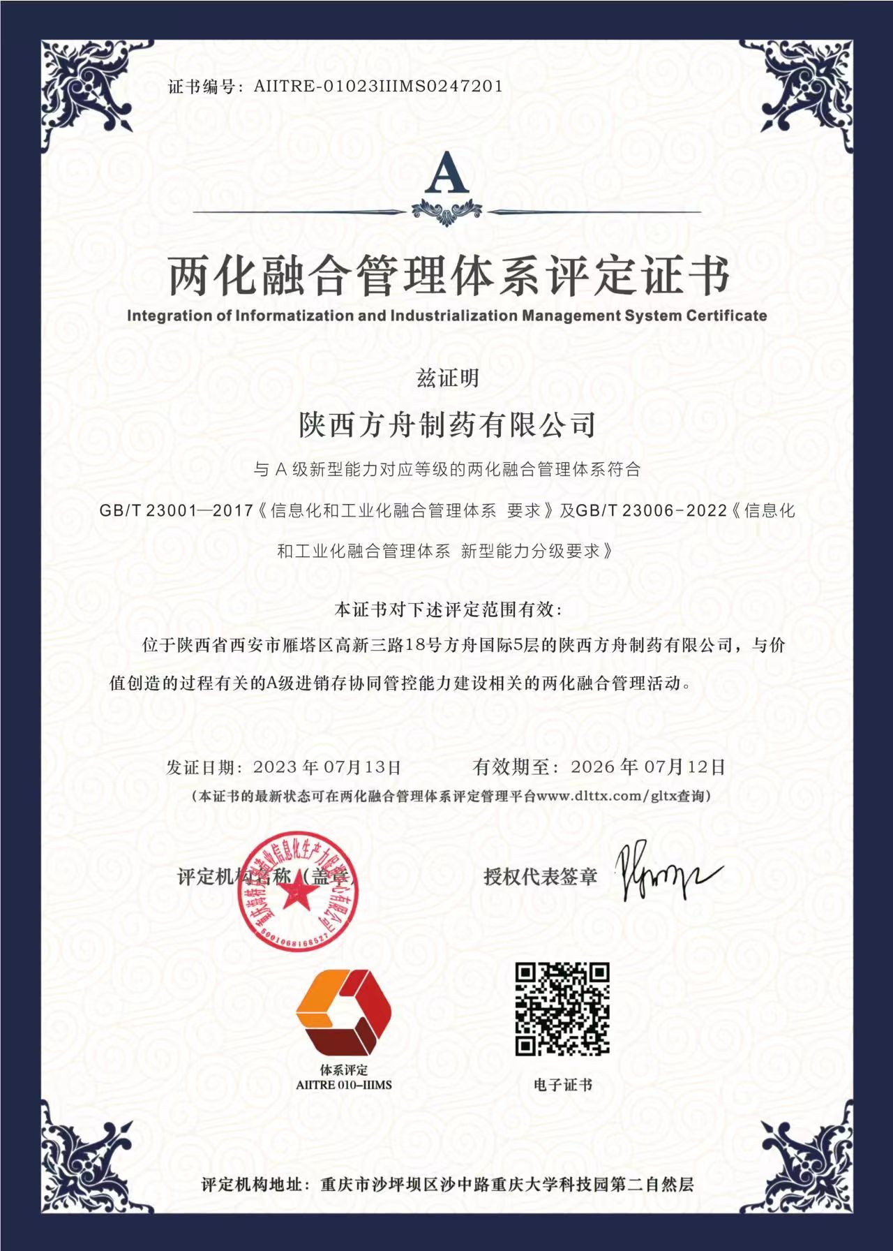 陜西方舟制藥榮獲兩化融合國家級認證證書